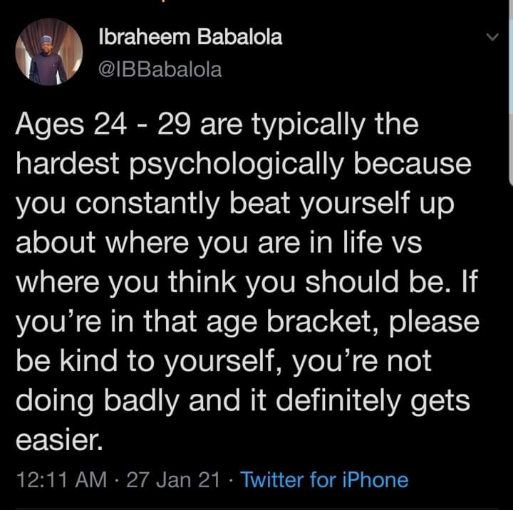 - “Ages 24-29 are typically the hardest psychologically because you constantly beat yourself up about where you are in life vs where you think you should be. If you’re in that age bracket, please be kind to yourself, you’re not doing badly and it definitely gets easier.” – Ibraheem Babalola