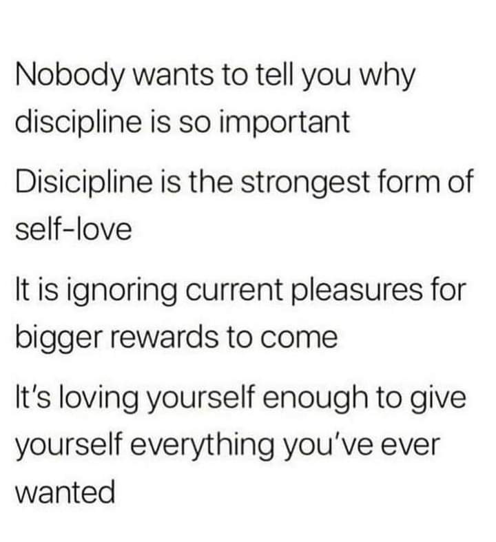 - “Nobody wants to tell you why discipline is so important. Discipline is the strongest form of self-love. It is ignoring current pleasures for bigger rewards to come. It’s loving yourself enough to give yourself everything you’ve every wanted.” – Unknown