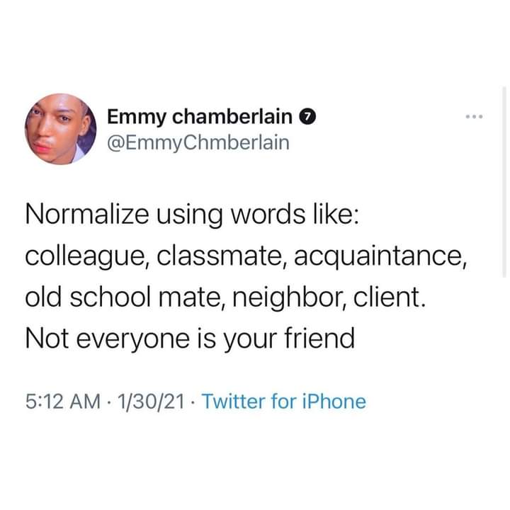 - “Normalize using words like: colleague, classmate, acquaintance, old school mate, neighbor, client. Not everyone is your friend.” – Emmy Chamberlain