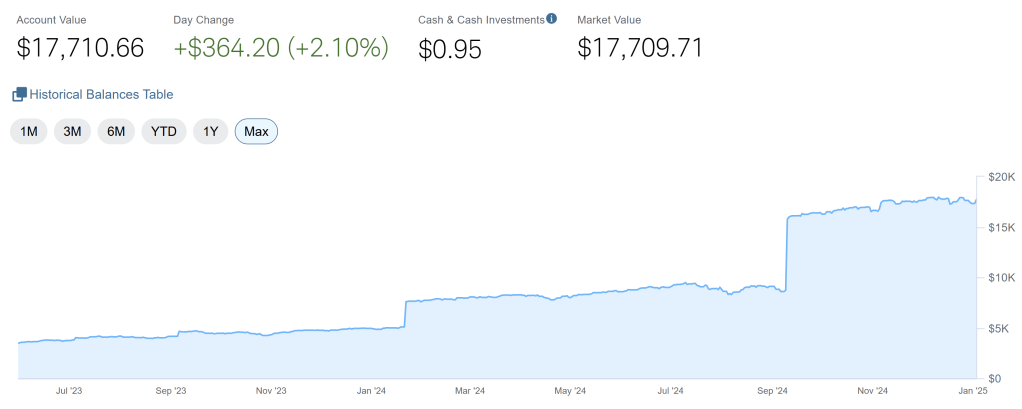 Below are just some statistics of what was gained when I was transferred to Charles and Schwab in May 2023 until December 2024. This is NOT including what I contributed, so overall, my account gained $3,562.28 in this time. This is investment money that was gained in my portfolio.